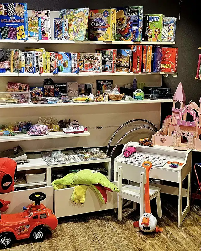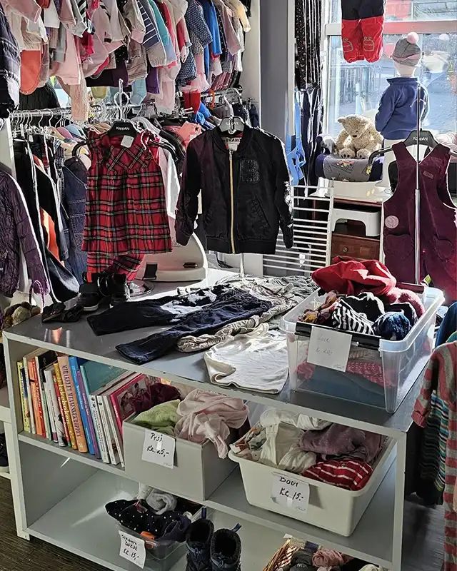I butikken selges møbler, klær og sko til barn og voksne, serviser og glass, nips, spill, leker, bøker, lamper og mye, mye mer. Overskuddet deles mellom Haslum menighet sitt barne- og ungdomsarbeid og Okhaldhunga sykehus i Nepal.
