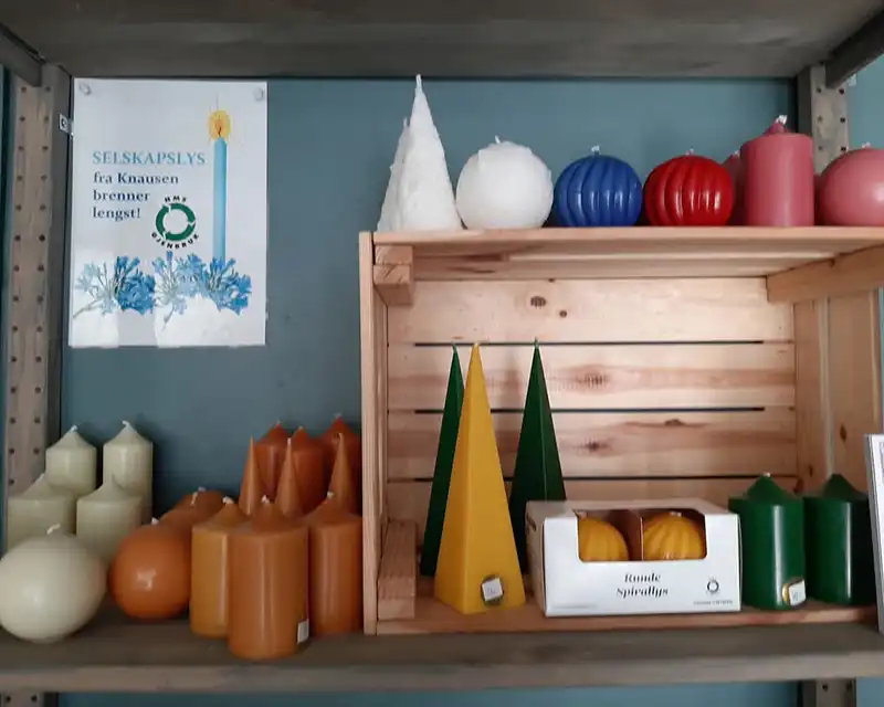 Et av butikkens særegne tilbud er de populære Knausen-lysene og tennbrikettene, produsert av smeltede lysrester fra butikk-kjedens eget lysstøperi. Disse håndstøpte lysene er både vakre og miljøvennlige, og brenner lenge med jevn flamme.